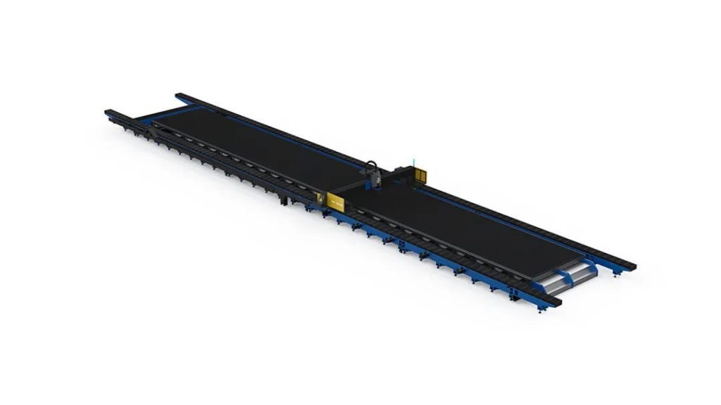 飓风系列XW无限宽幅面高速激光切割机采用革命性的模块化拼接设计,突破传统设备幅面限制,可实现无限大幅面切割。床身单侧墙体宽度400mm,其独创的多管叠焊结构配合自适应机械补偿系统,在12万瓦超高功率工况下仍能保持±0.05mm/m的切割精度。该机型特别针对船舶分段建造、钢构铁塔、风电塔筒等超大型构件加工场景,配备的实时跟随分区除尘系统,加速度达1.5g,支持超高功率高可达12万瓦,完美解决重工领域”大而不精”的行业难题。