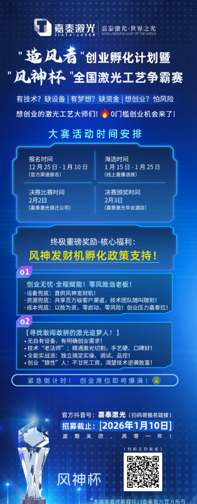 嘉泰激光正式发起“造风者”创业孵化计划,同期举办首届“风神杯”全国激光工艺争霸赛!这不止是一场顶尖工艺的巅峰对决,更是一次激光人逆袭创业的黄金机遇!我们要找的不只是工艺高手,更是心怀火焰、敢闯敢拼的未来创业者——在这里,你的技术被极致尊重,你的梦想被全力托举!